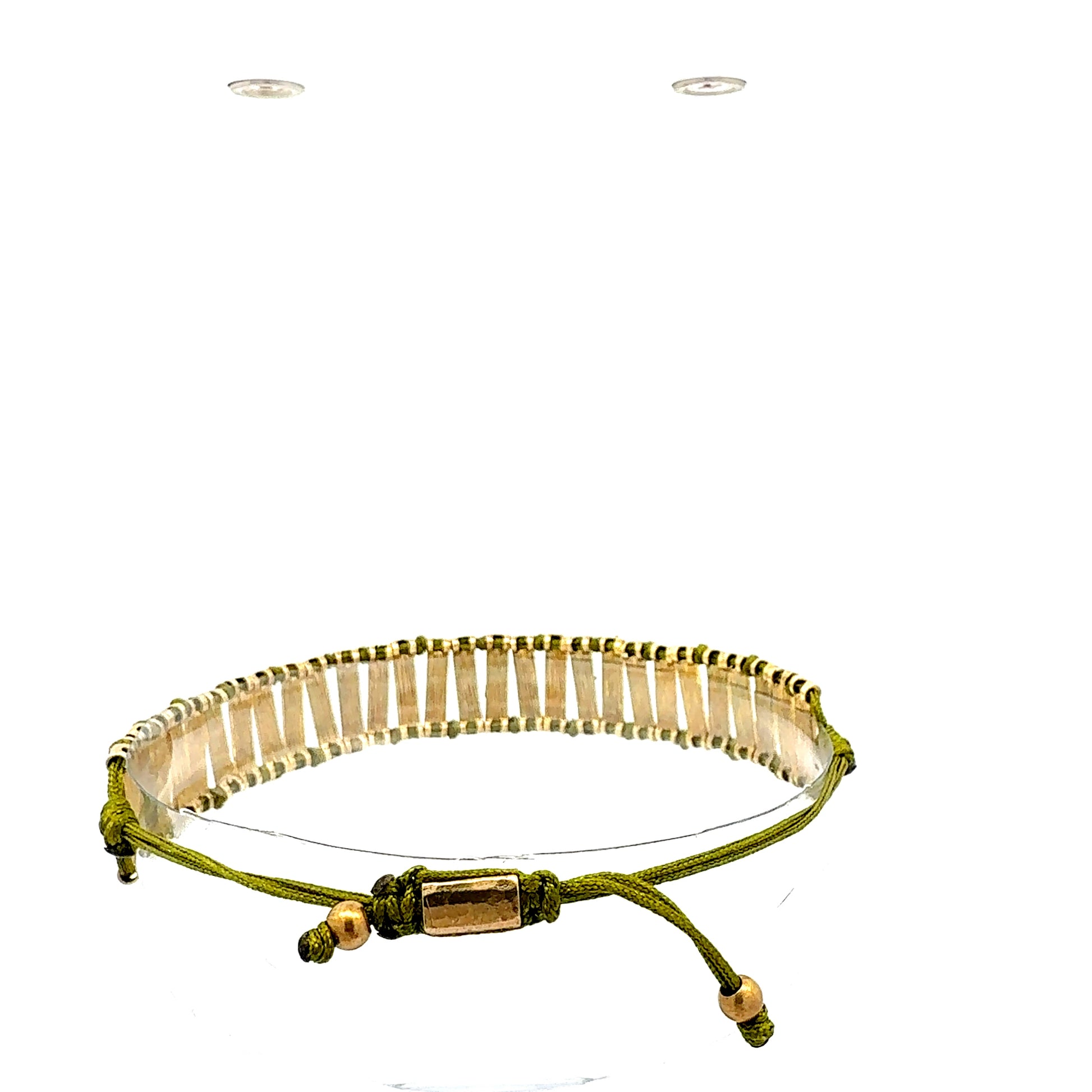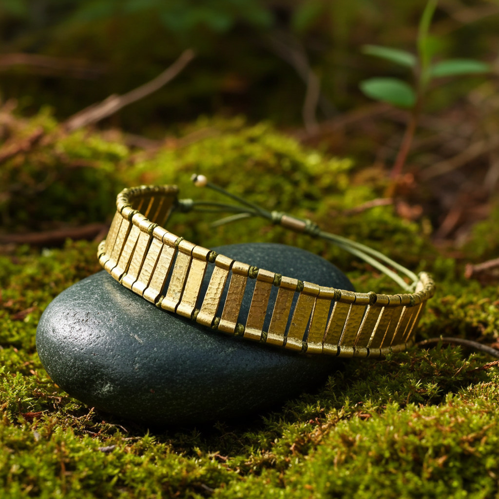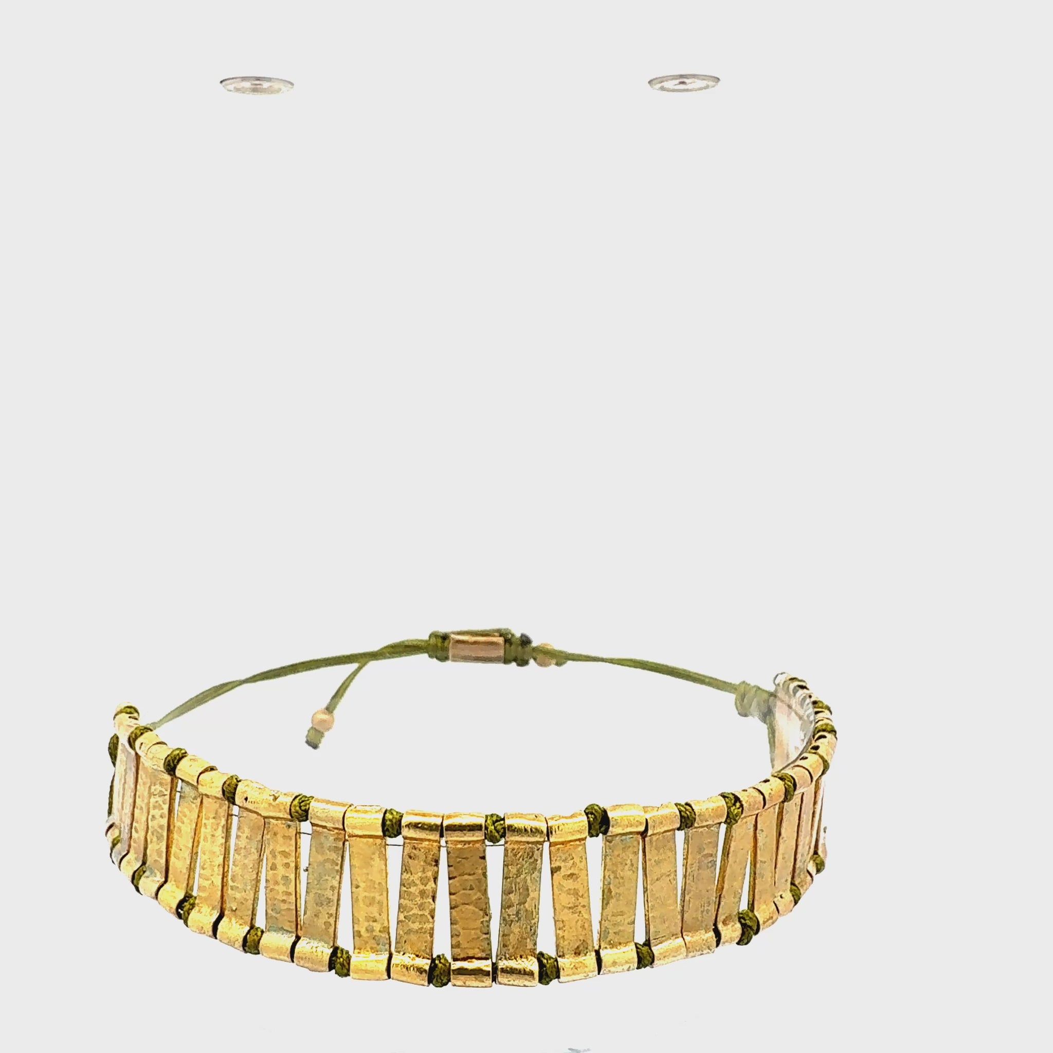 Dieses Schmuckstück besticht durch seine einzigartige Kombination aus warmen, goldfarbenen Metallplättchen und einem robusten, olivgrünen Textilband. Jedes einzelne Plättchen hat eine individuell gehämmerte Oberfläche, die das Licht auf wunderschöne Weise bricht und dem Armband eine lebendige, organische Textur verleiht. Das Design erinnert an antike Schätze und verbindet rustikalen Charme mit moderner Eleganz.