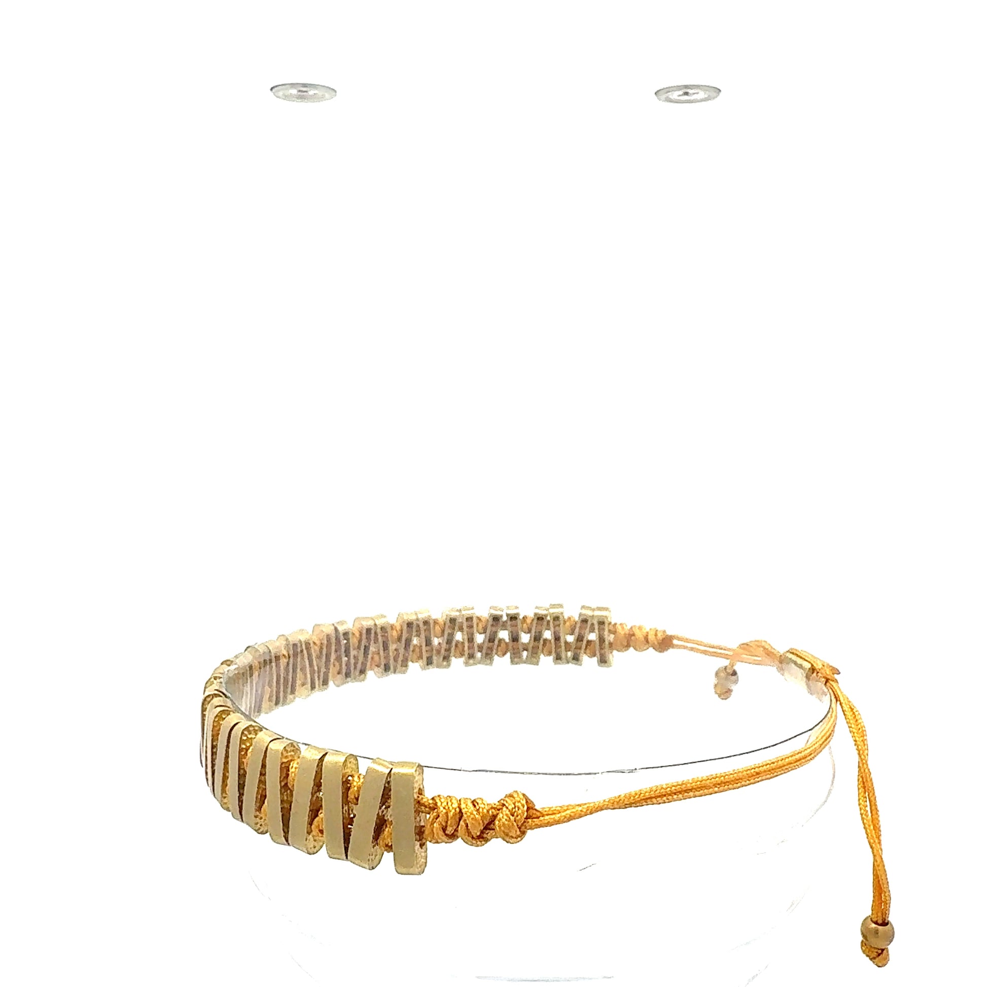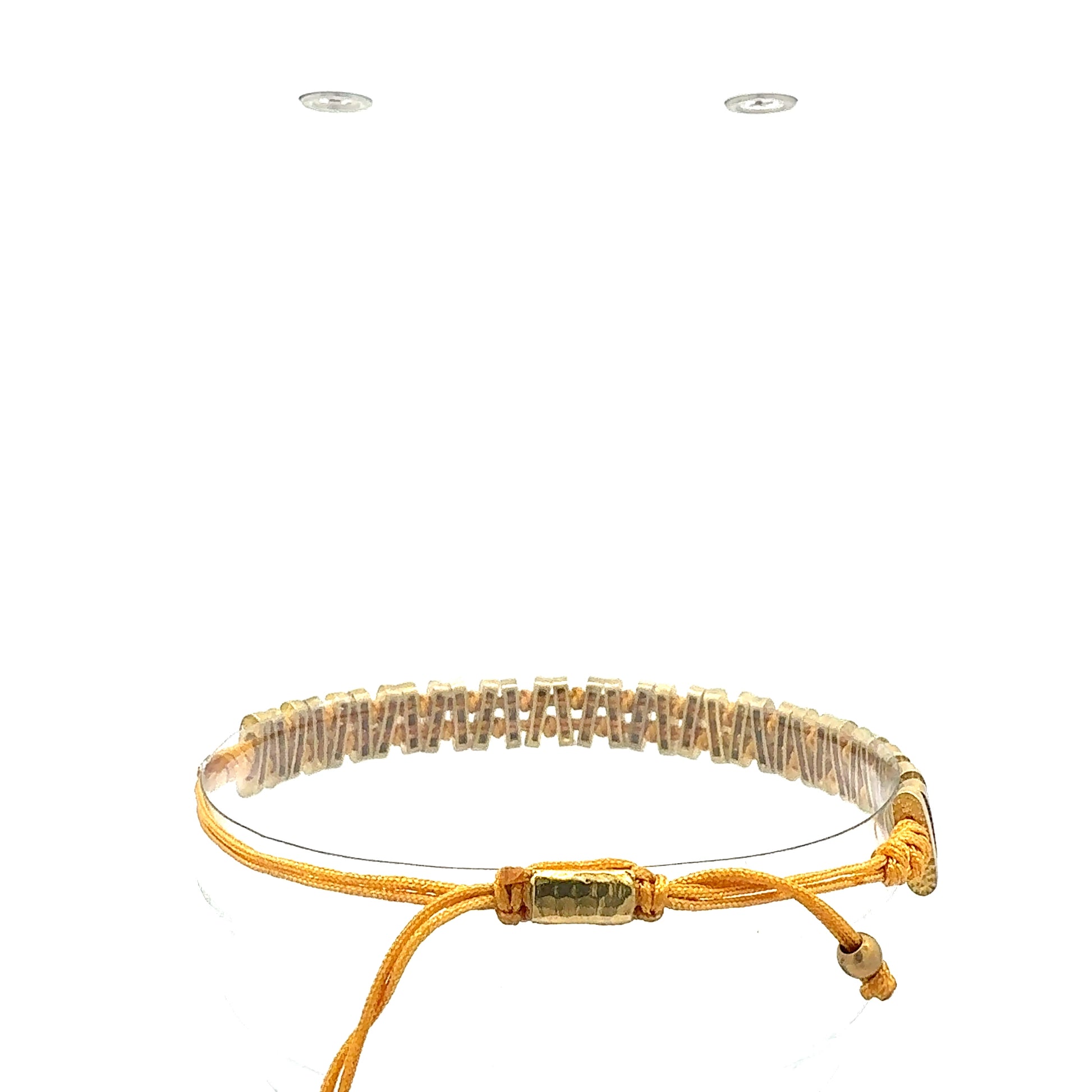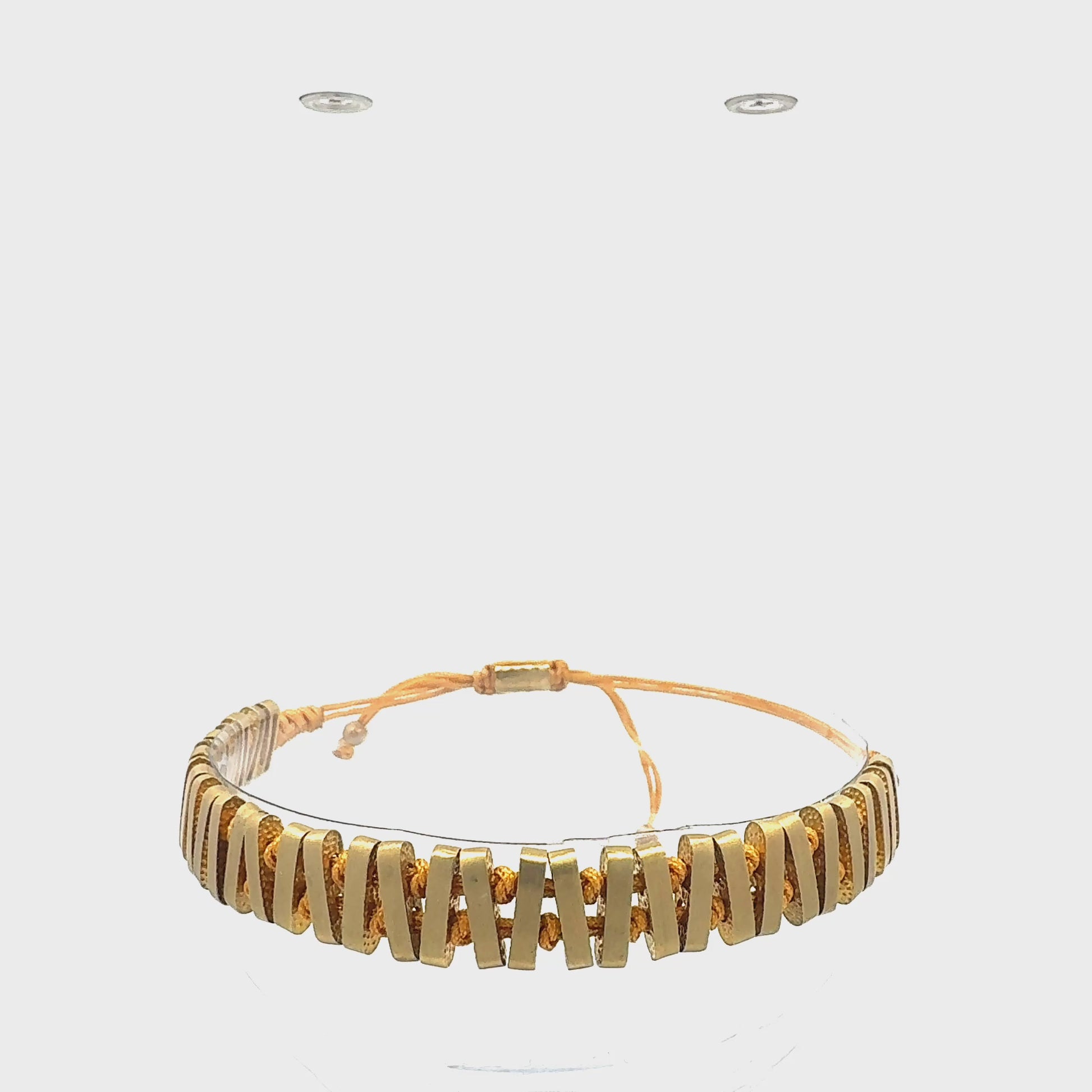 Dieses Schmuckstück verbindet die warme Ausstrahlung von Bronze mit feinen, länglichen Metallstäbchen in goldfarbener Optik. Das naturfarbene, reißfeste Textilband harmoniert perfekt mit den glänzenden Metallelementen und schafft eine Kombination aus Natur und Luxus – wie der Sonnenlauf über den Horizont.