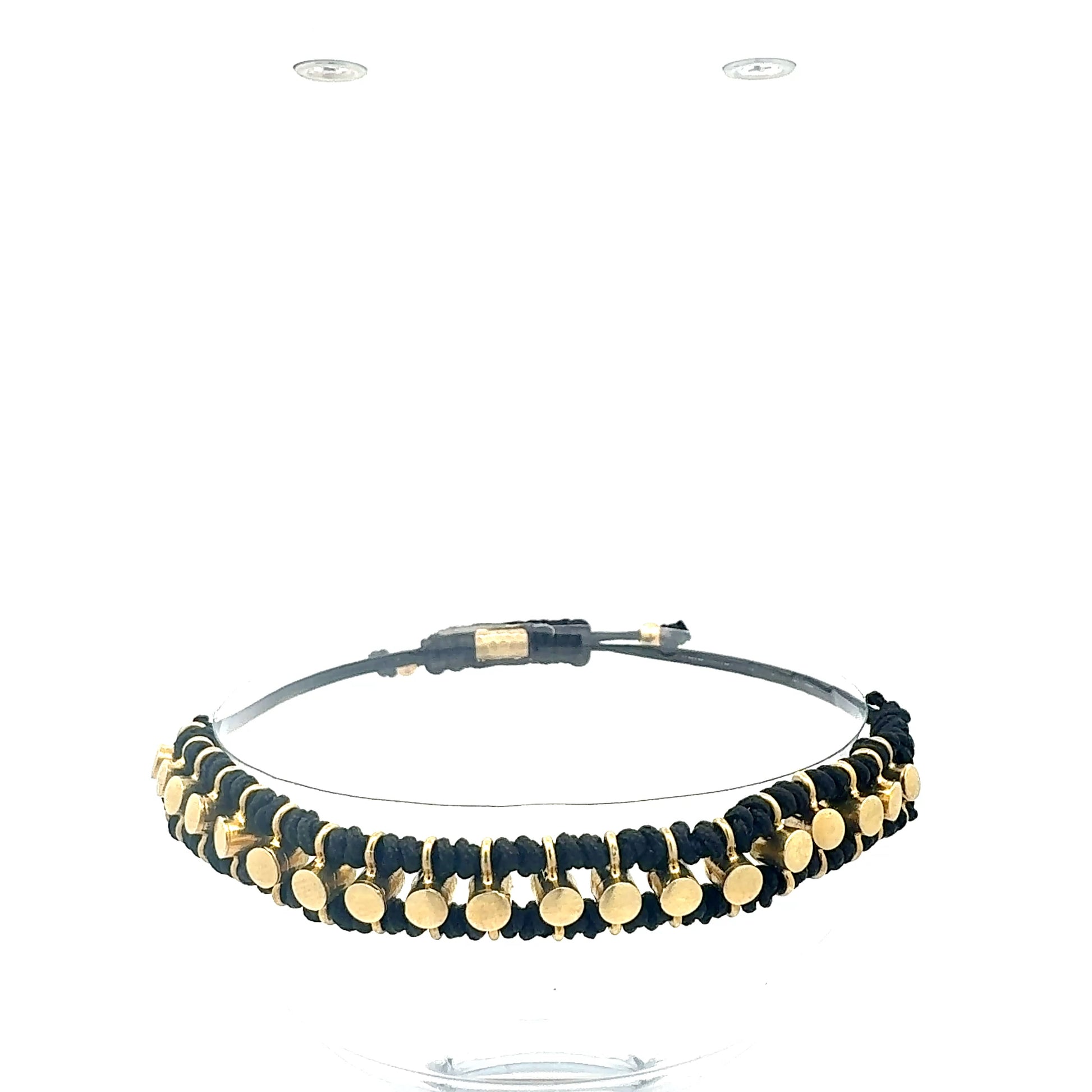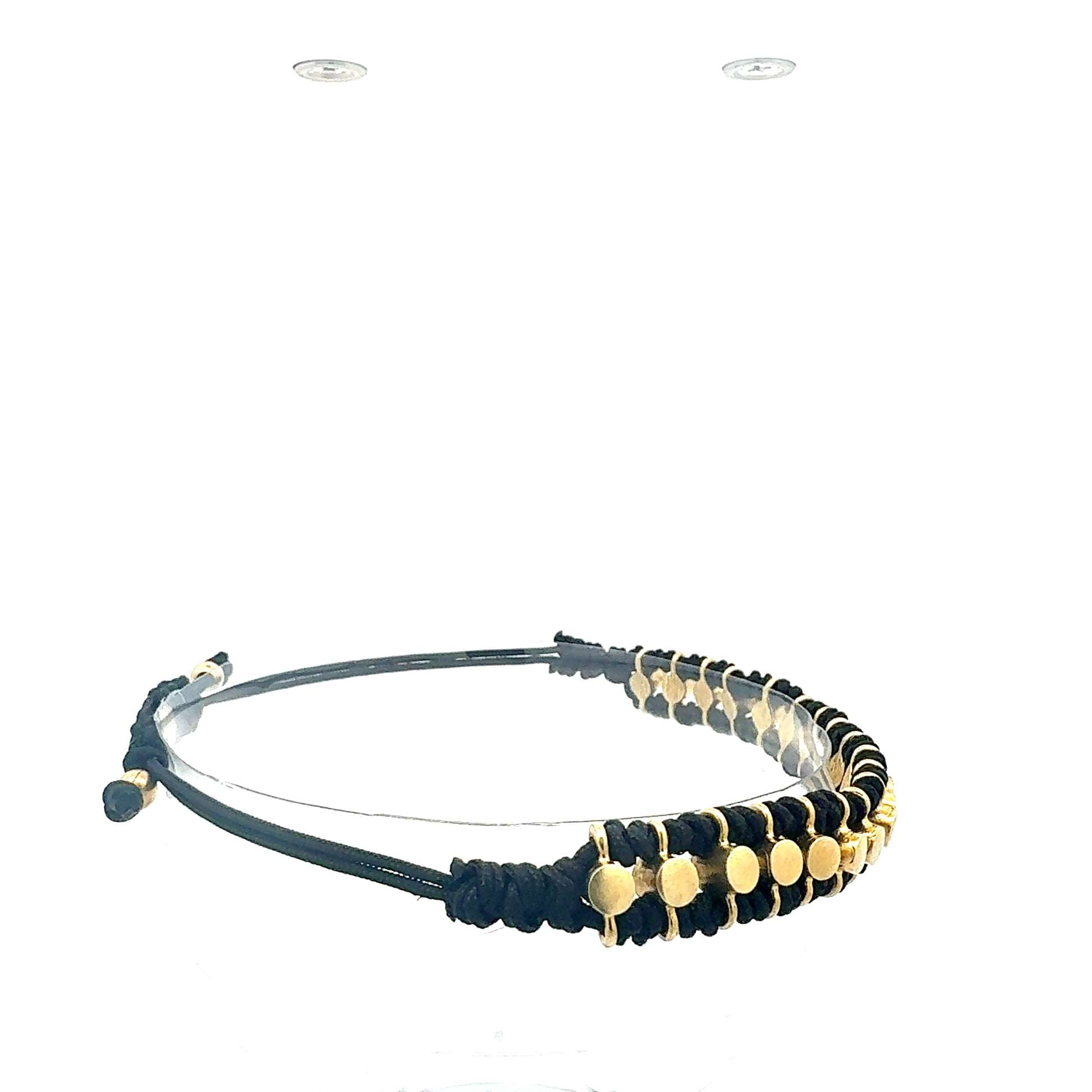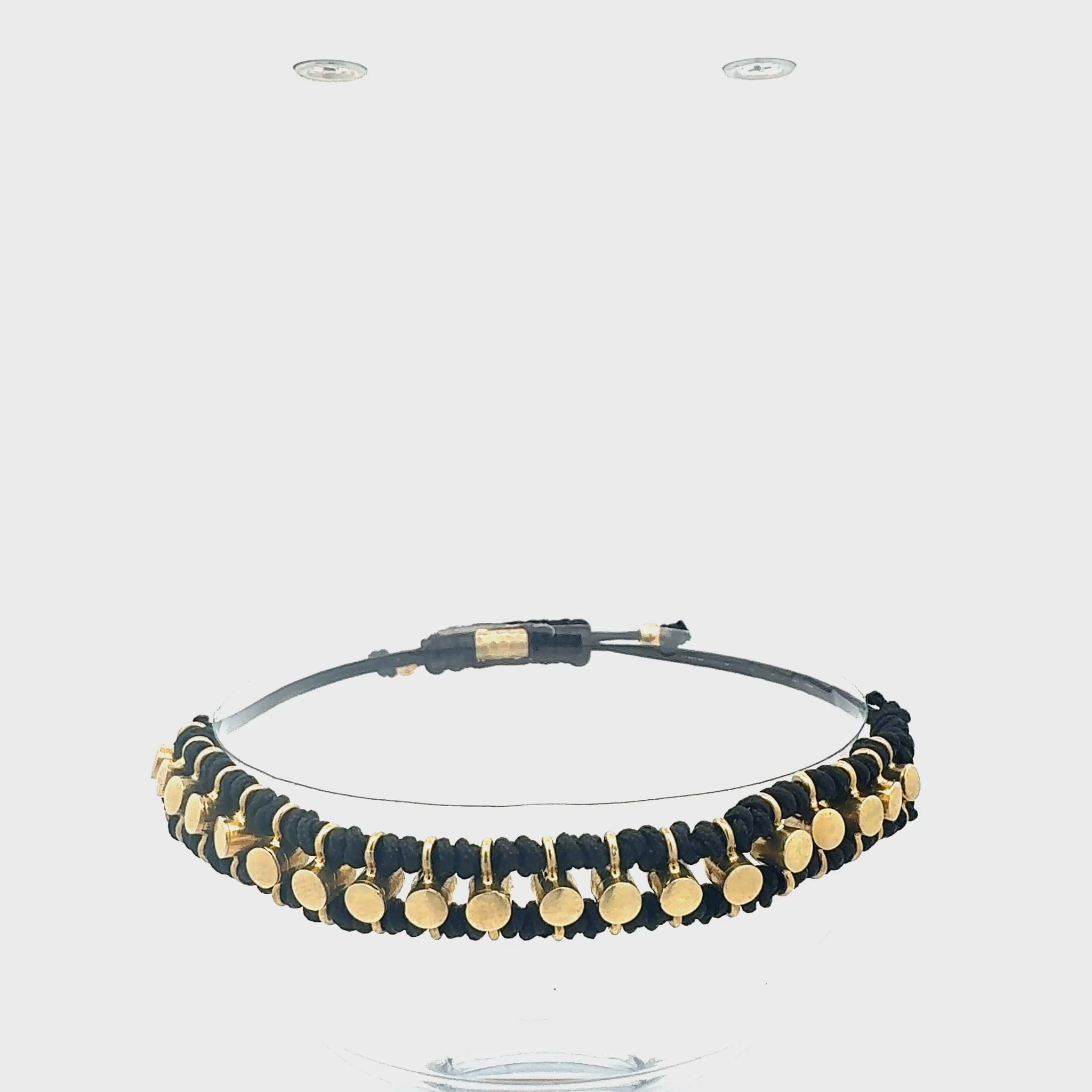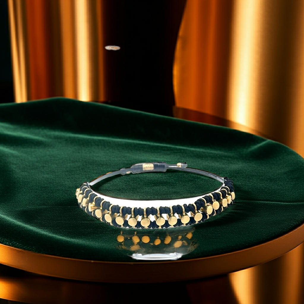Feine, goldfarbene Metallplättchen sind kunstvoll in ein tiefschwarzes Makramee-Band eingearbeitet und erzeugen einen wunderschönen Kontrast. Das Design ist sowohl edel als auch alltagstauglich und passt perfekt zu jedem Anlass – ob im Büro oder bei einem besonderen Abend.