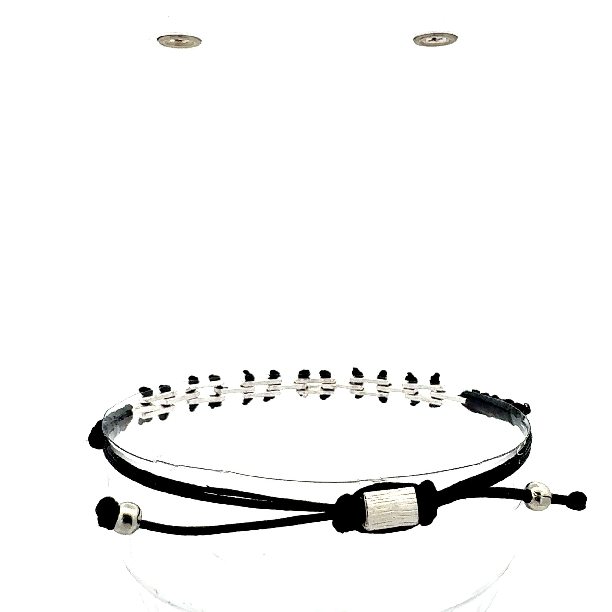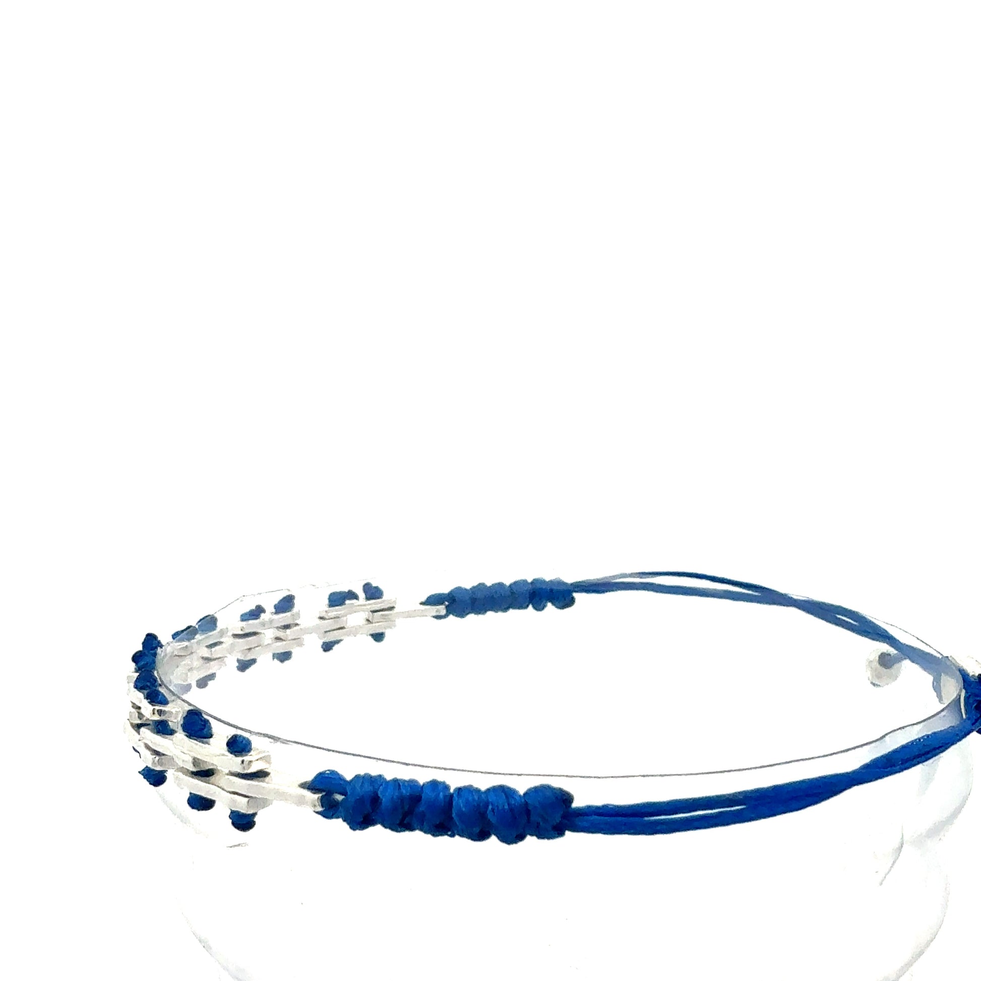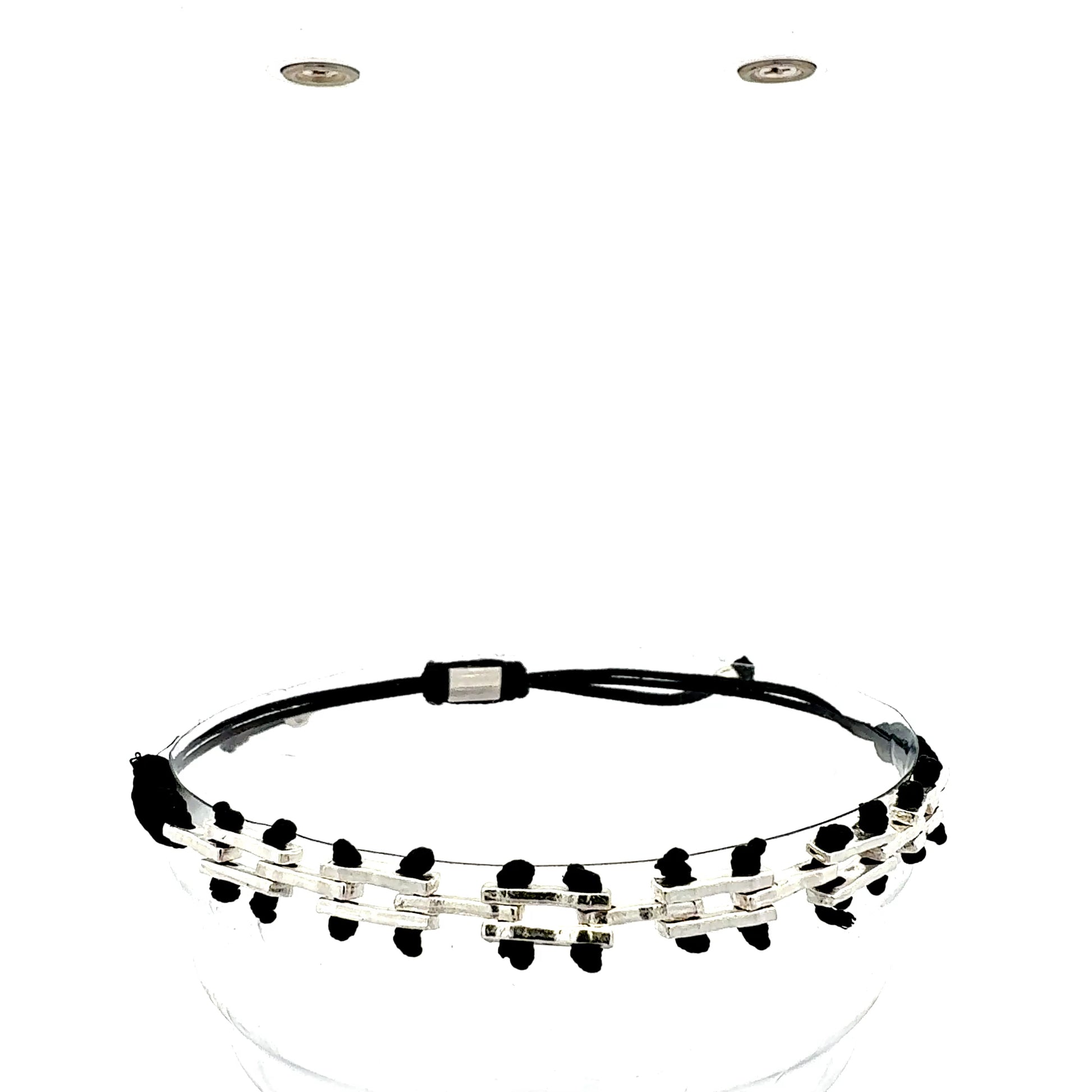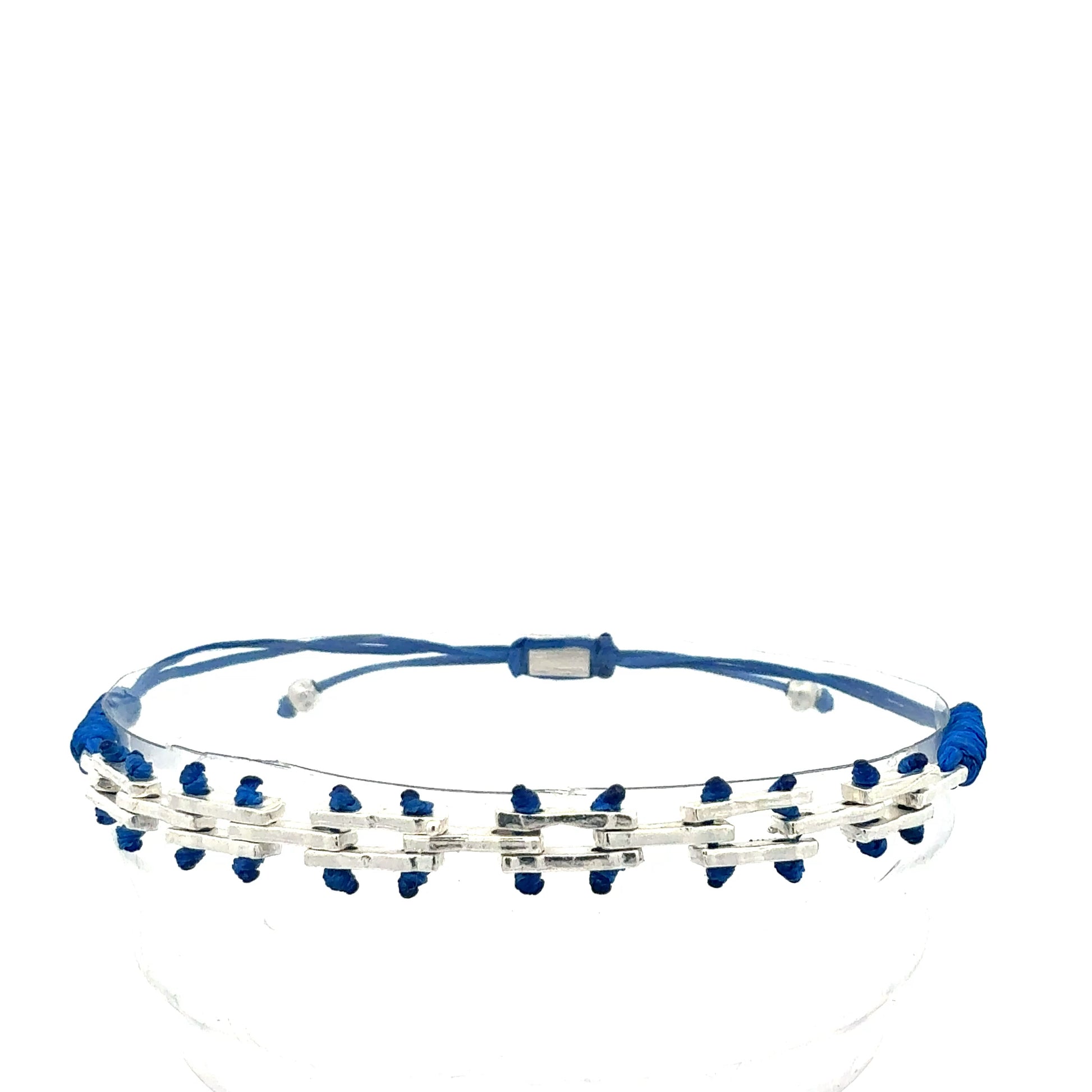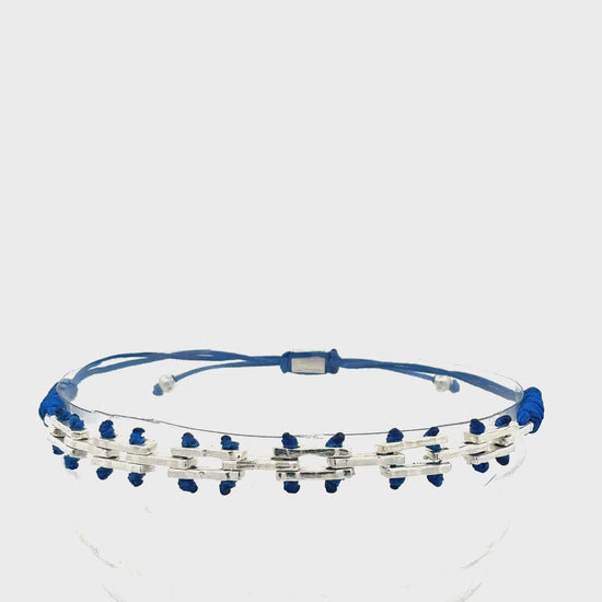 Dieses elegante Schmuckstück besticht durch sein grafisches Design, bei dem silberfarbene, rechteckige Glieder durch ein farbiges Makramee-Band miteinander verbunden sind. Die Anordnung in zwei Reihen verleiht dem Armband eine besondere Tiefe und eine moderne, architektonische Anmutung.