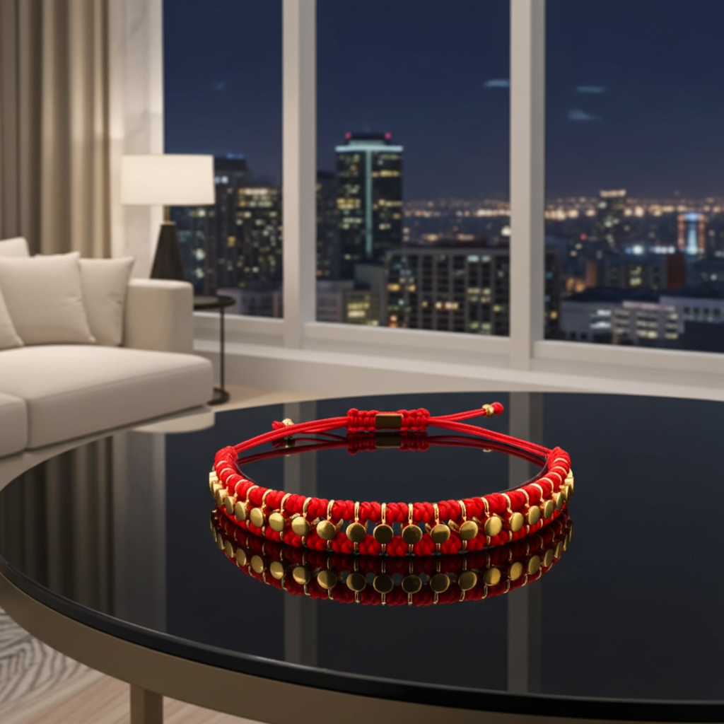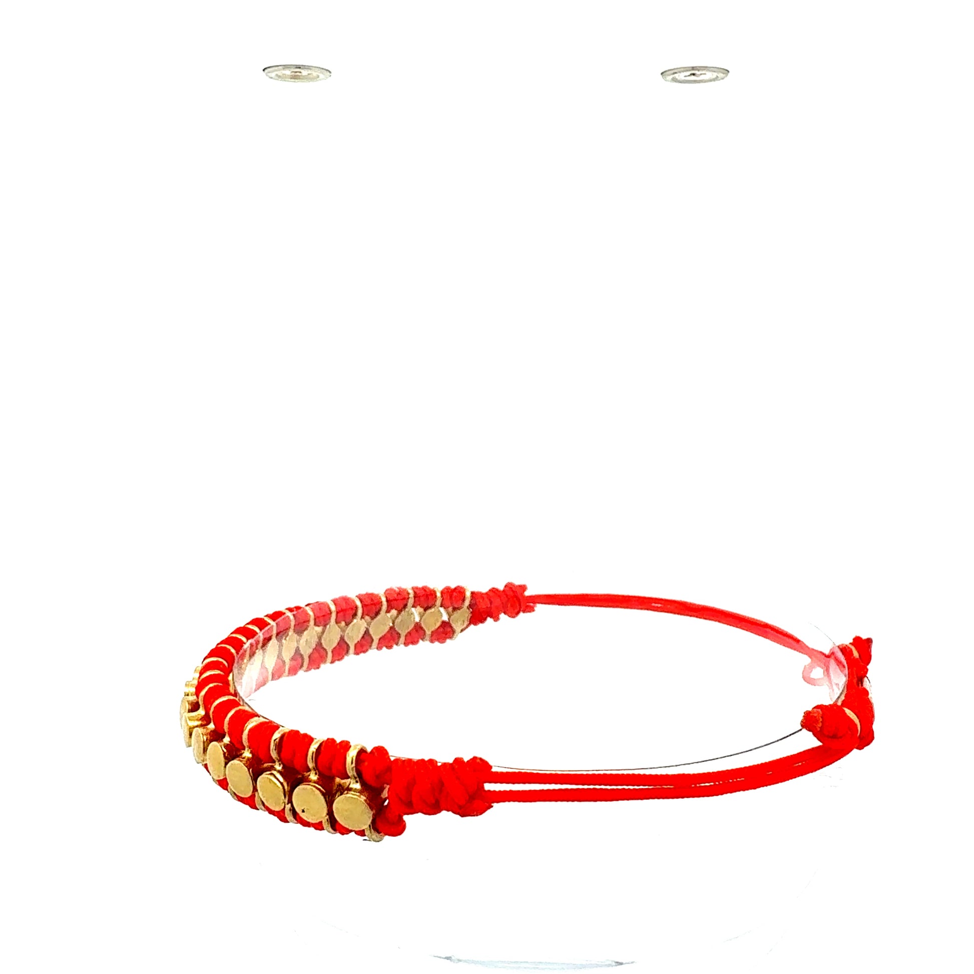 Feine, goldfarbene Metallplättchen sind kunstvoll in ein kräftiges, rotes Makramee-Band eingearbeitet. Diese Kombination schafft einen atemberaubenden Kontrast, der sofort ins Auge fällt. Das Armband ist ein ausdrucksstarkes Accessoire, das Ihrem Outfit einen Hauch von Farbe und Raffinesse verleiht.