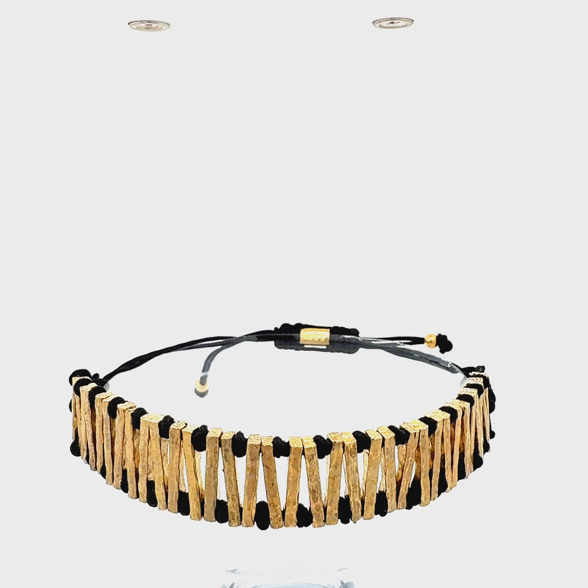 Dieses Schmuckstück ist ein absoluter Blickfang und besticht durch seine dynamische Anordnung von unterschiedlich langen, edel texturierten Metallstäbchen. Das Design erinnert an ein musikalisches Nachtstück, voller Rhythmus und Tiefe, und wird durch das tiefschwarze Band perfekt in Szene gesetzt.